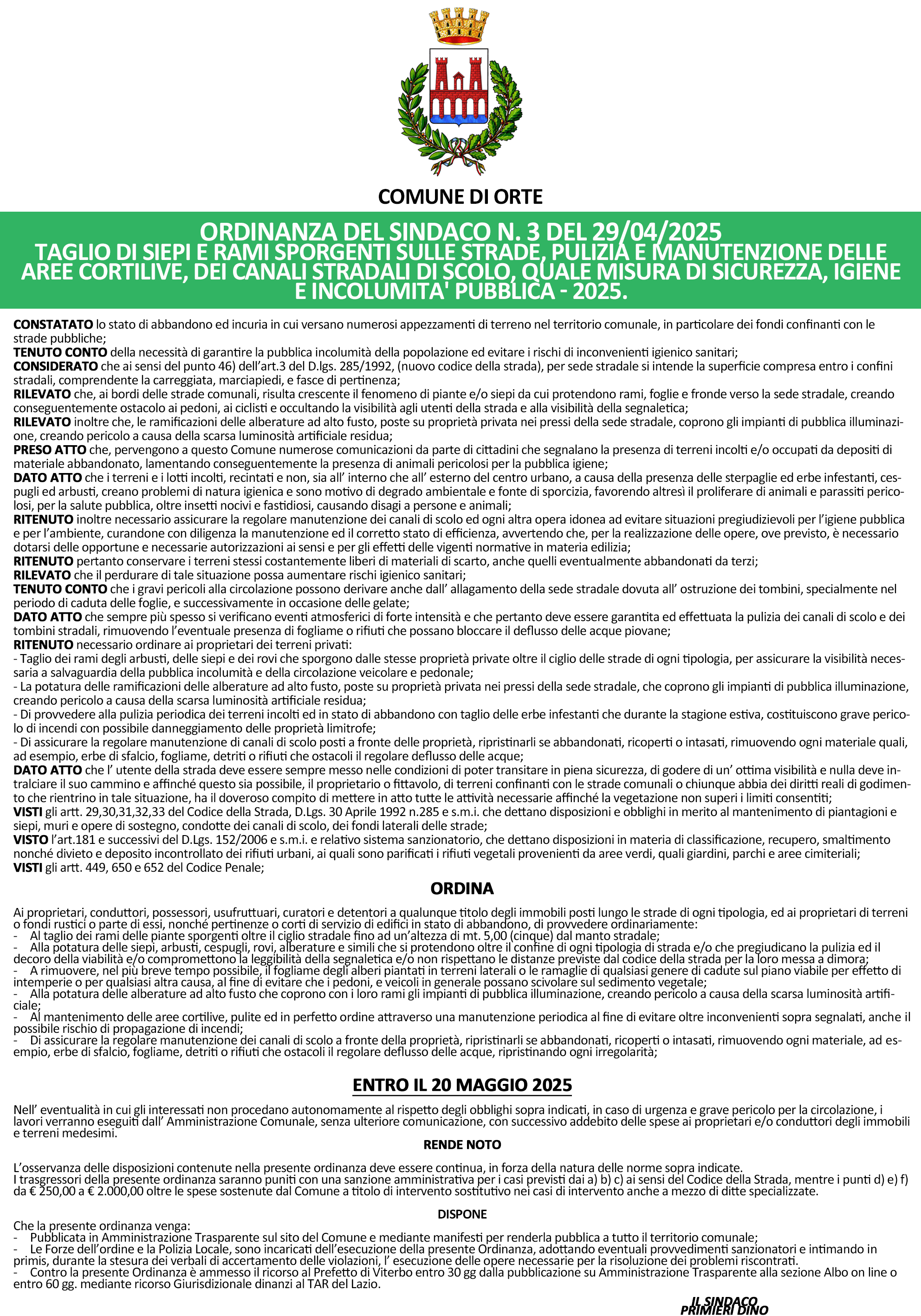 Taglio di siepi e rami sporgenti sulle strade, pulizia e manutenzione delle aree cortilive, dei canali stradali di scolo, quale misura di sicurezza, igiene e incolumita' pubblica - 2025.